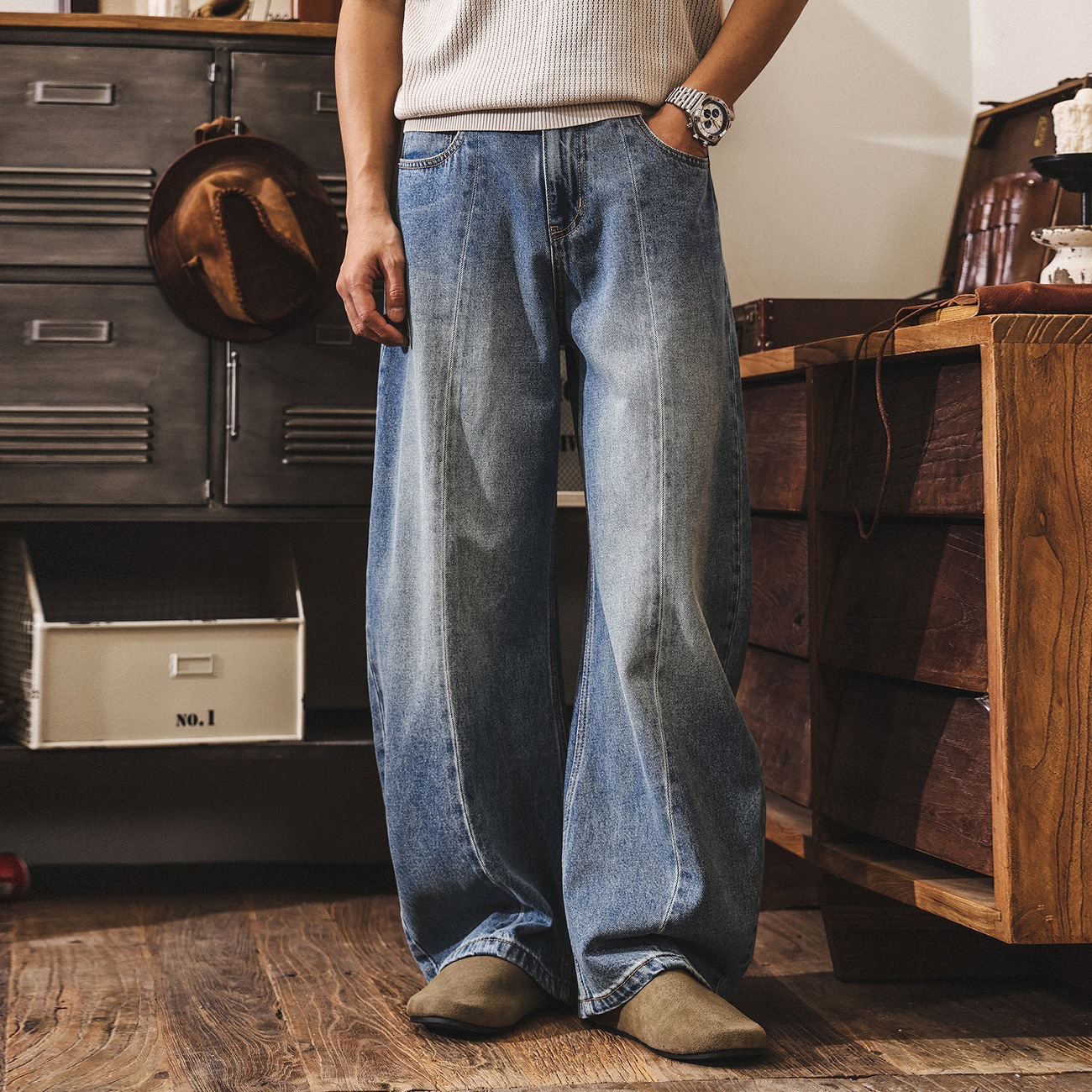 美式復古春季牛仔褲男款2026新款潮牌寬鬆闊腿彎刀褲男生休閒長褲