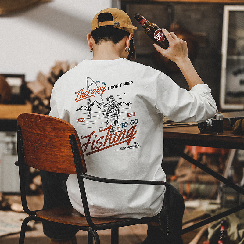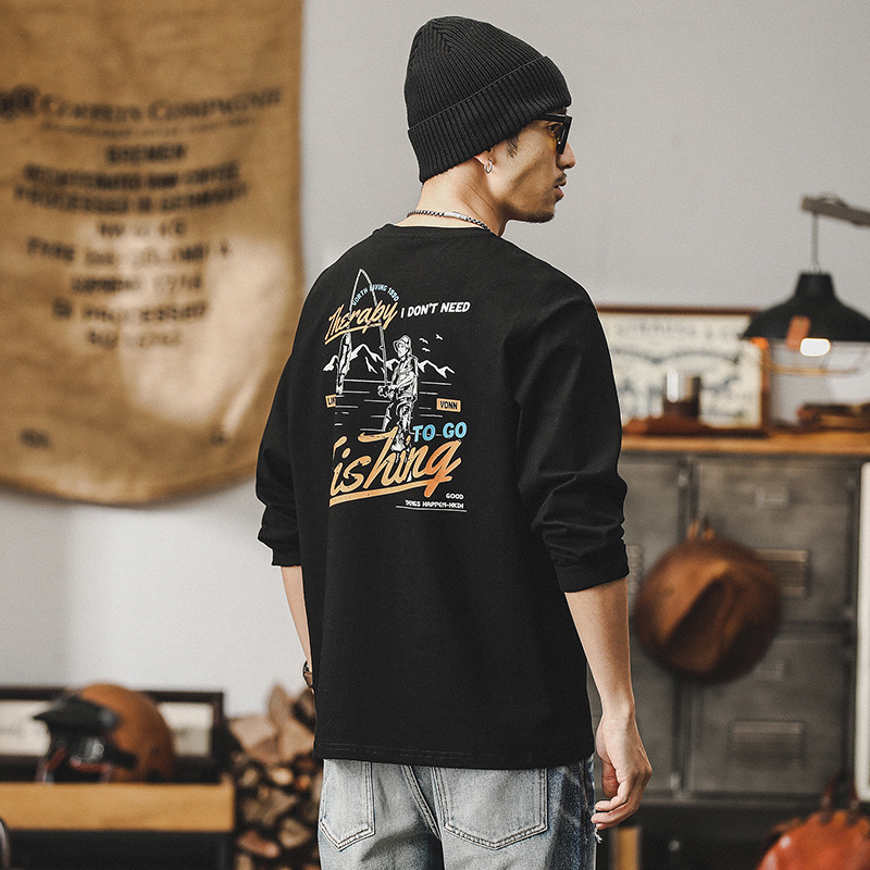美式戶外釣魚印花重磅T恤男長袖2024新款男裝潮牌寬鬆上衣男