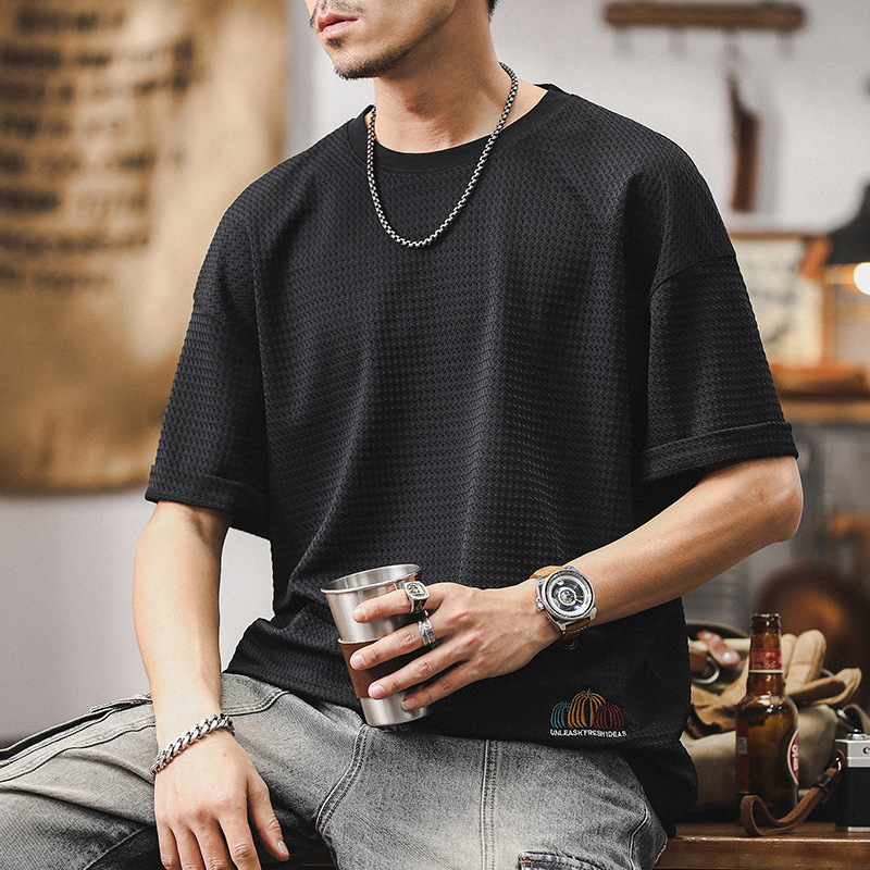 夏季新款高級感提花短袖t恤男美式潮流設計寬鬆休閒半袖男士上衣