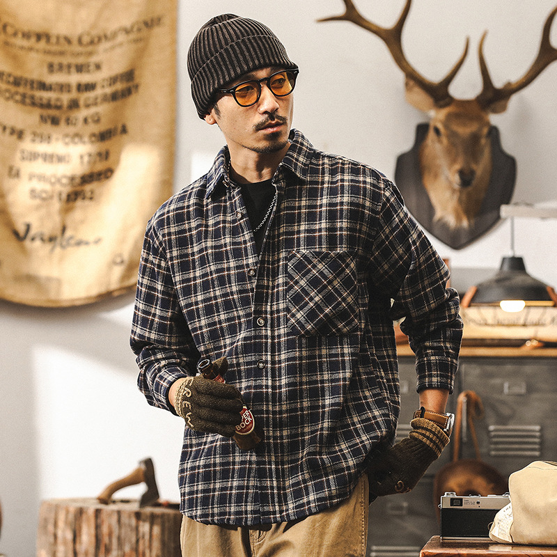 美式復古425g重磅磨毛色織格子襯衫男秋冬款潮牌寬鬆休閒襯衣男款