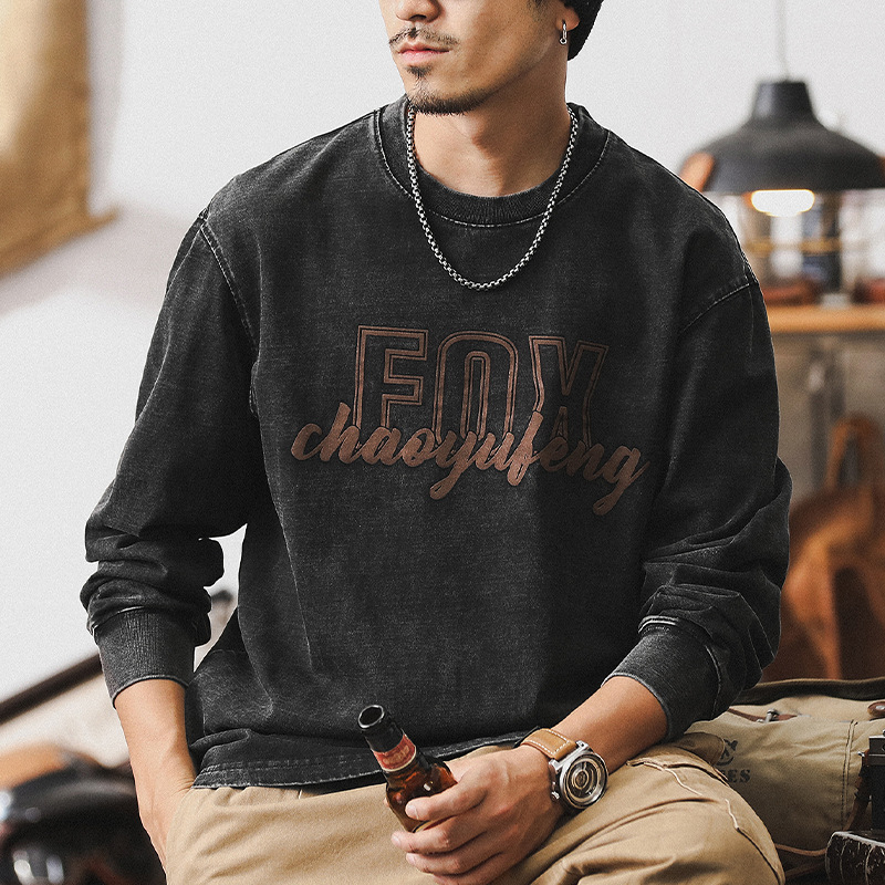 美式重磅複古長袖T恤男秋季炒砂水洗上衣潮2024新款寬松男裝