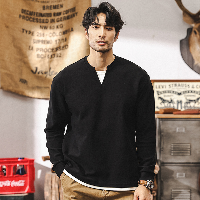 美式復古360g重磅長袖T恤男秋季新款潮牌雙層V領假兩件寬鬆上衣男