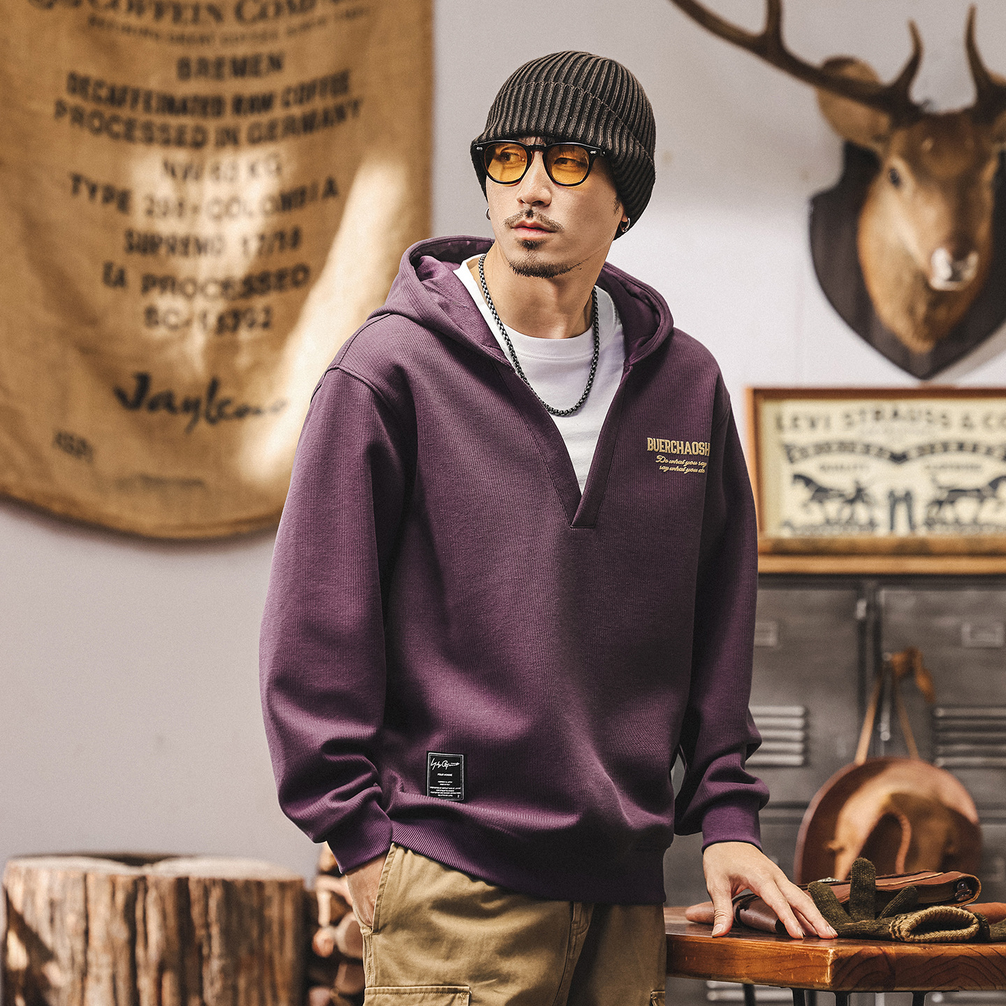 美式復古重磅假兩件V領連帽衛衣男春秋新款紫色潮流寬鬆休閒上衣
