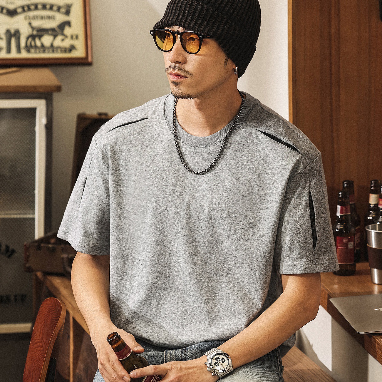 美式復古開口笑小解構男士短袖T恤夏季2026新款潮流拼接寬鬆上衣T