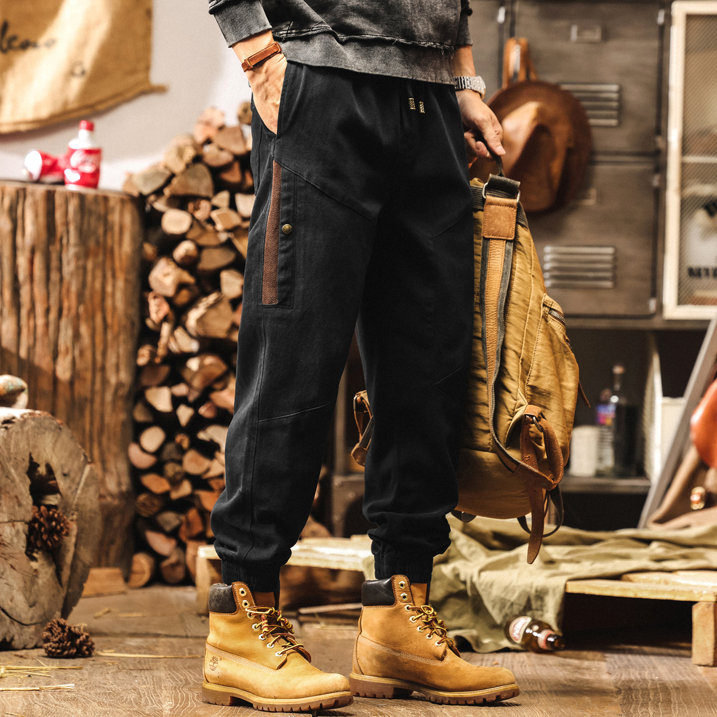 美式復古重磅黑色工裝褲子男2025秋季寬鬆新款拼接束腳男士休閒褲
