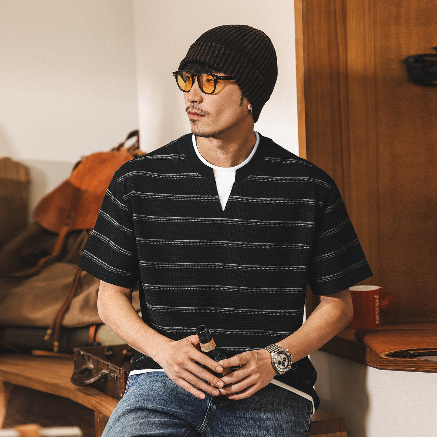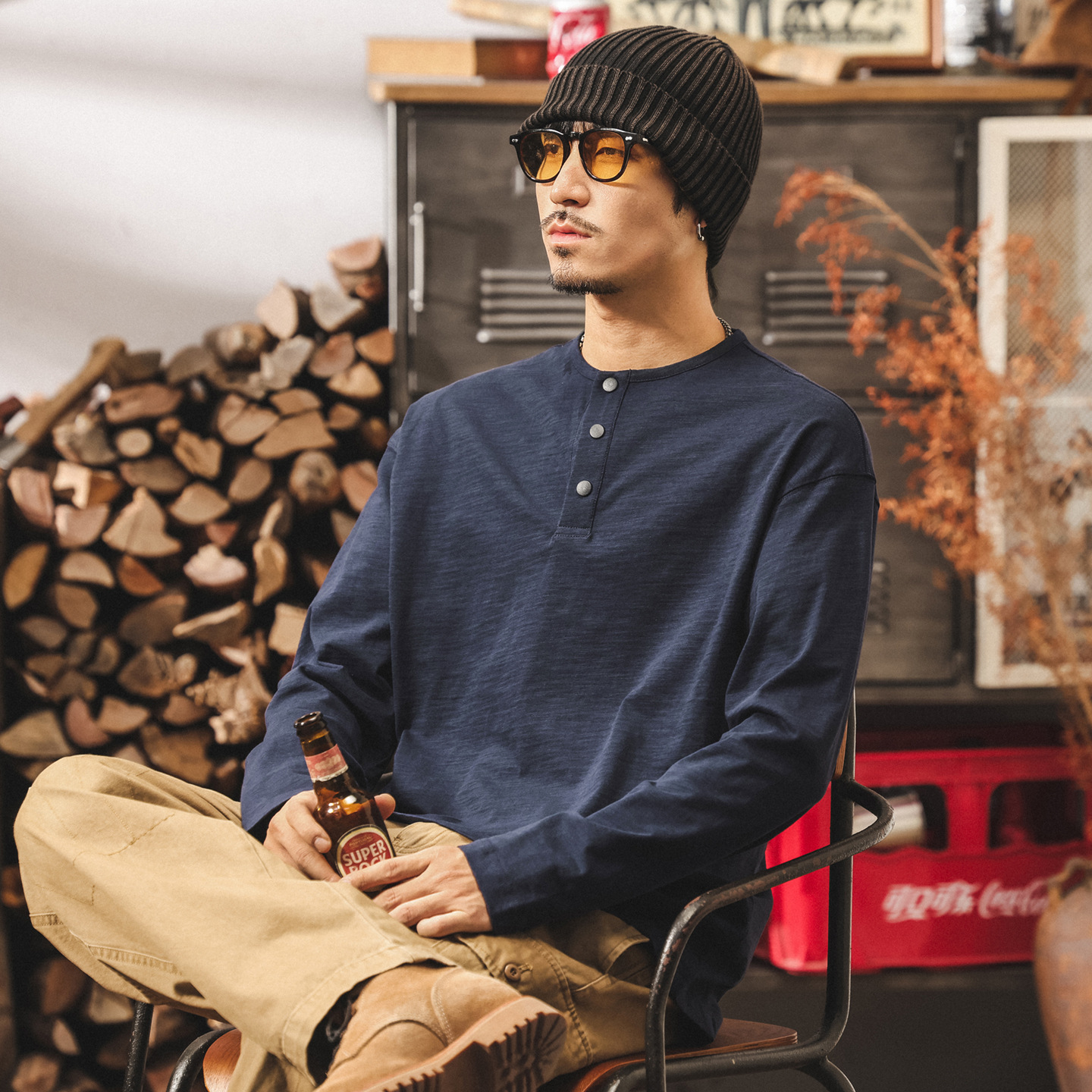 美式復古280g重磅竹節棉t恤男秋季新款潮流亨利領長袖polo衫
