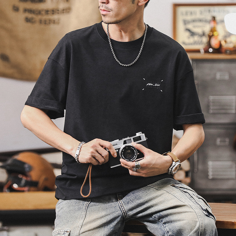 美式復古水洗做舊重磅T恤男短袖2025新款夏季寬鬆撞色半袖上衣男T