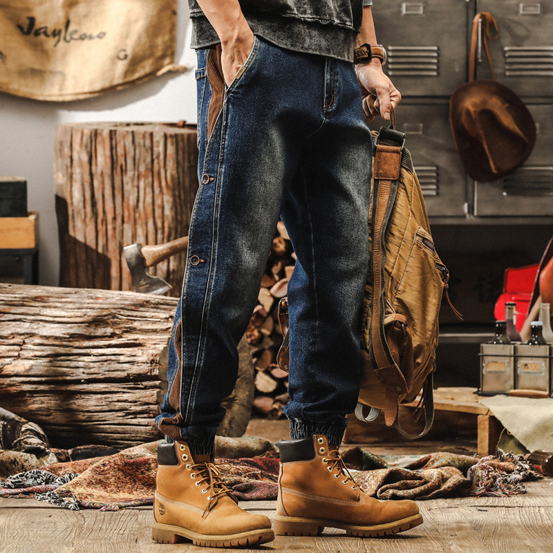 美式復古工裝褲子男秋季做舊寬鬆直筒牛仔褲男潮牌束腳排扣休閒褲