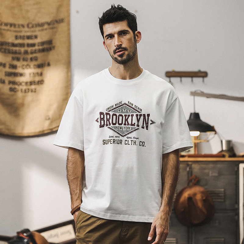 零縮力涼感T恤男短袖夏季美式復古山系印花休閒大碼美式重磅上衣