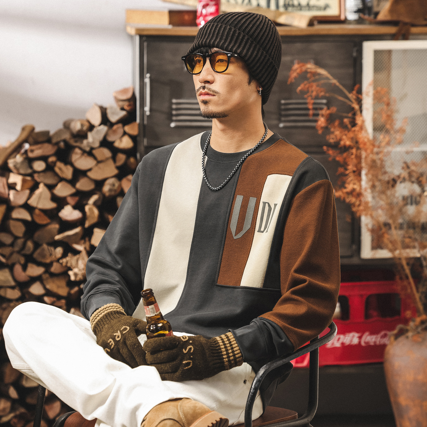 美式復古重磅衛衣男春秋款潮牌拼接結構撞色寬鬆男士上衣秋季外套