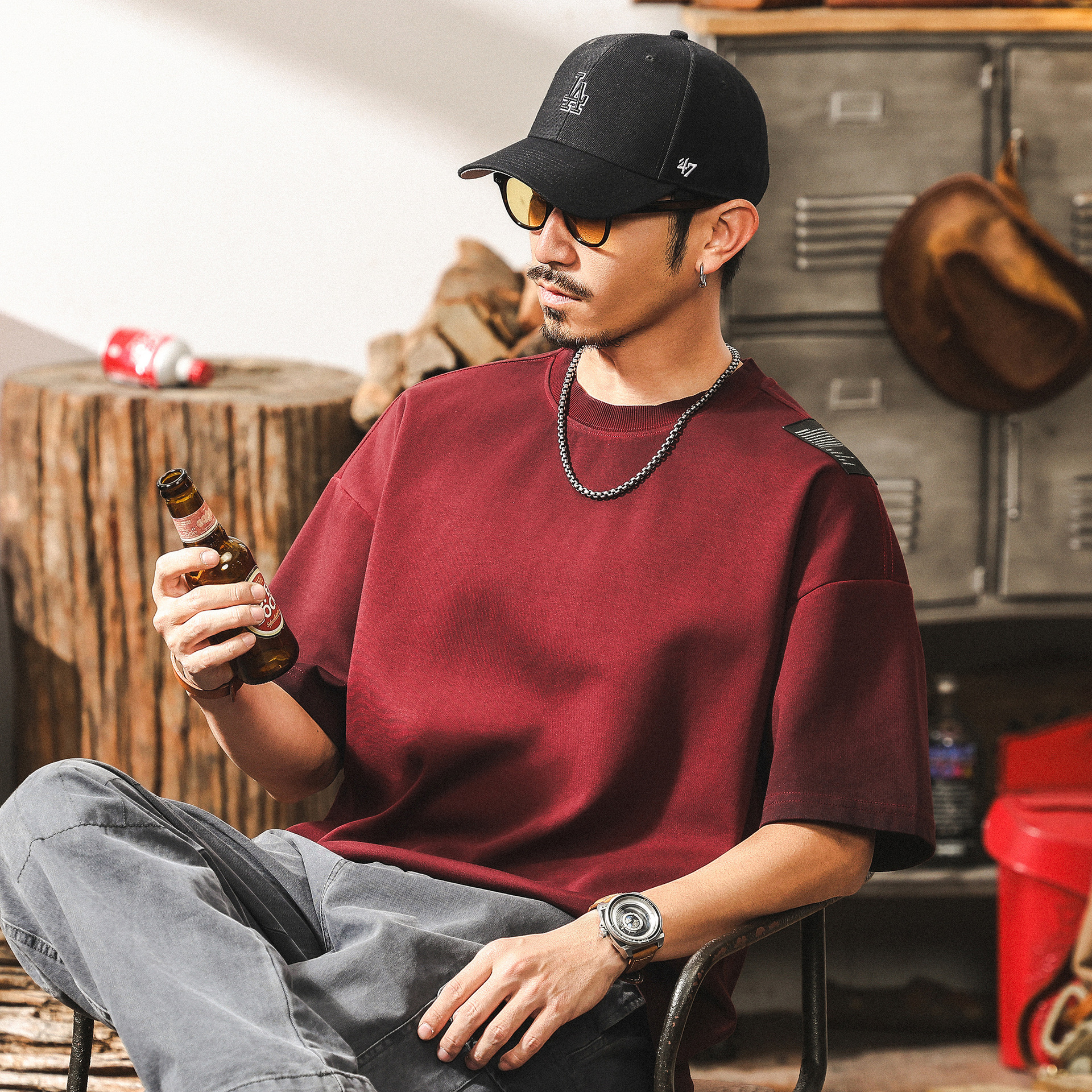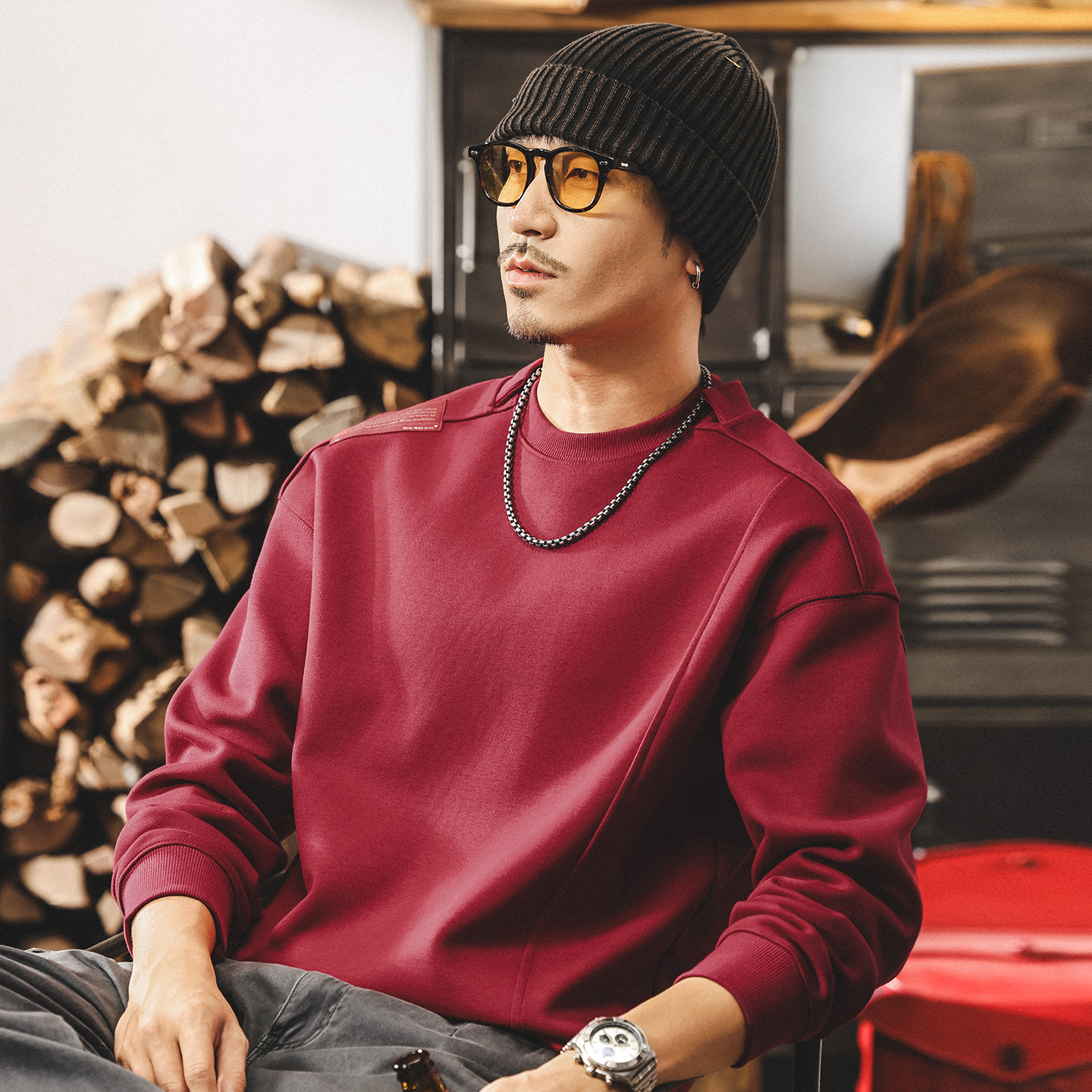 美式復古480g重磅衛衣男春秋2025新款拼接酒紅色寬鬆男士秋季上衣