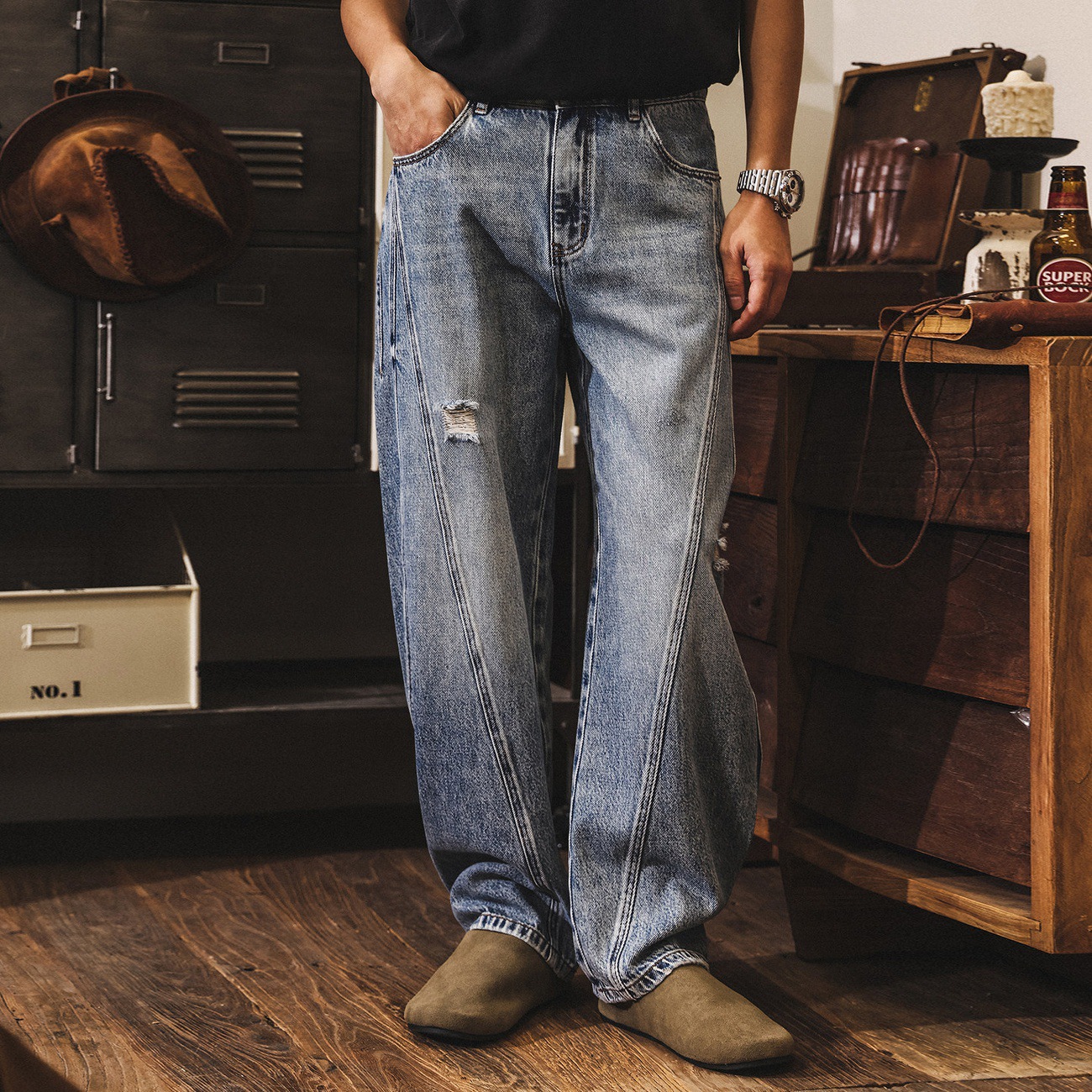 美式復古破洞牛仔褲男春季潮牌重水洗闊腿褲寬鬆直筒休閒彎刀褲男