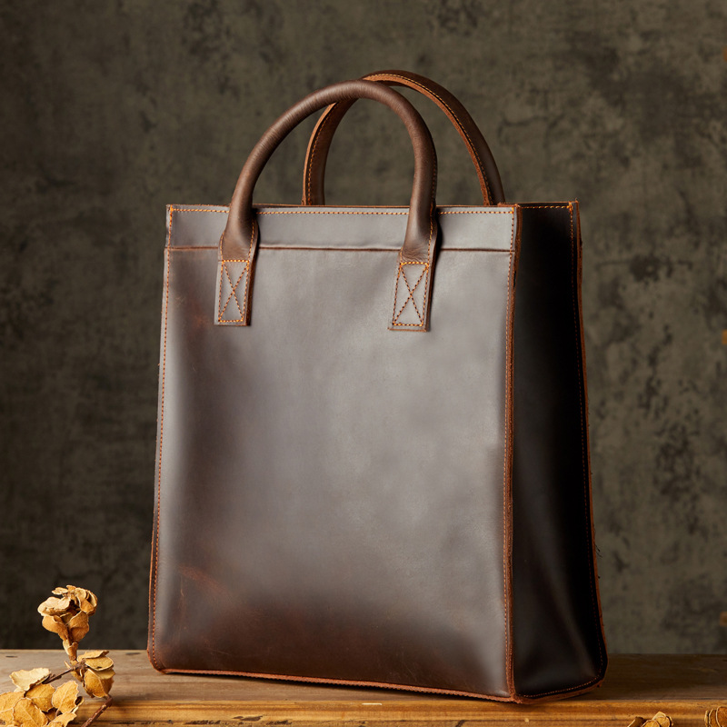 手工頭層牛皮商務通勤手提包男士單肩斜挎包復古瘋馬皮豎款公文包
