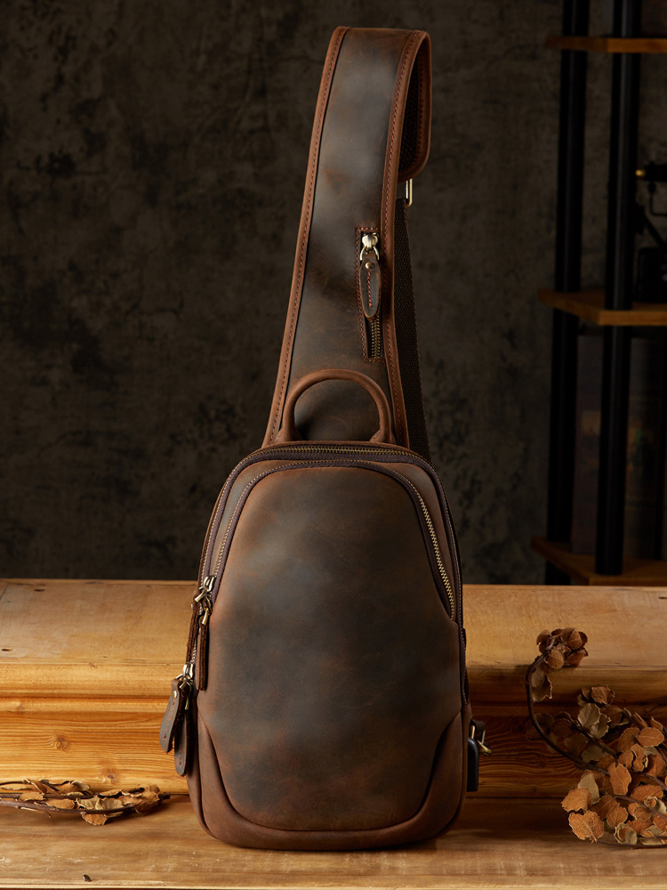 手工復古牛皮胸包男瘋馬皮單肩包斜挎包男士胸前包真皮韓版男包潮