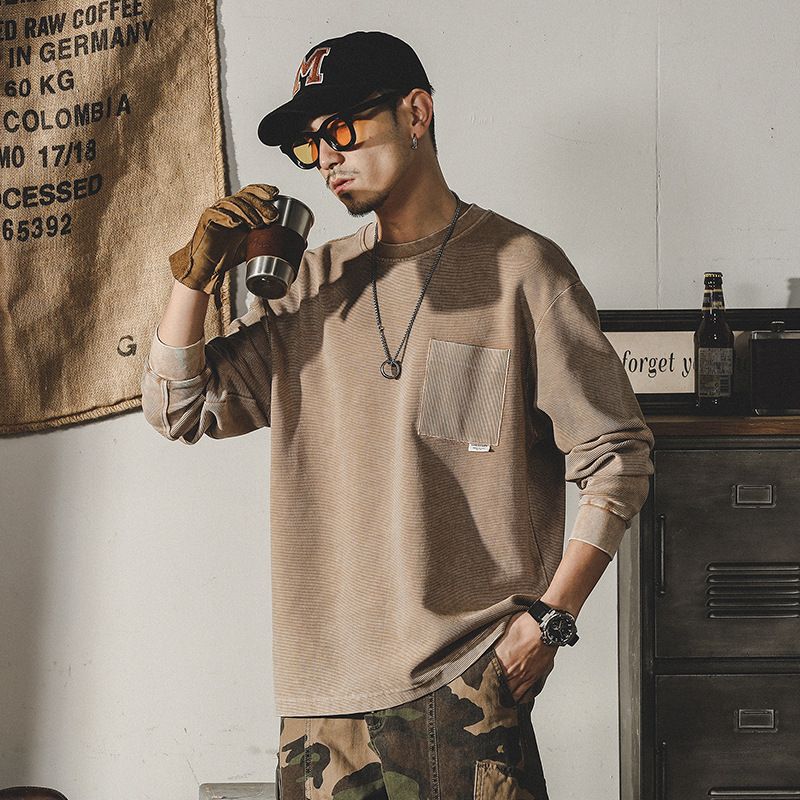 美式重磅長袖T恤男秋季潮牌雙口袋設計體恤男款百搭寬松白色上衣T