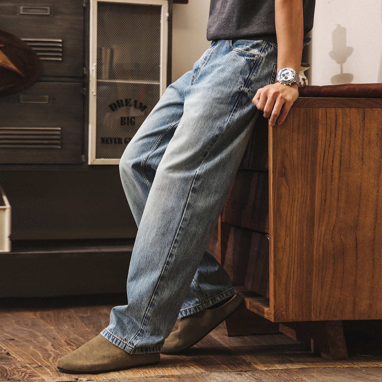 美式重磅復古牛仔褲男寬鬆直筒2023年春季新款做舊工裝闊腿褲子男