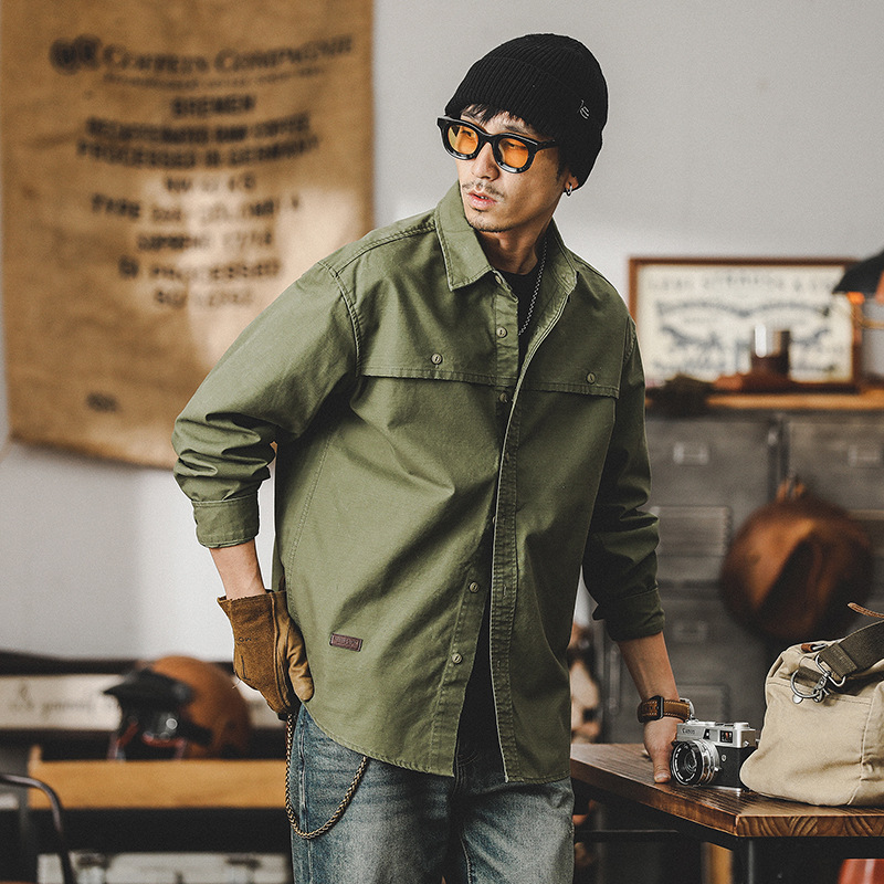 美式復古工裝襯衫男長袖2023年新款日系寬鬆大碼襯衣男春季外套男