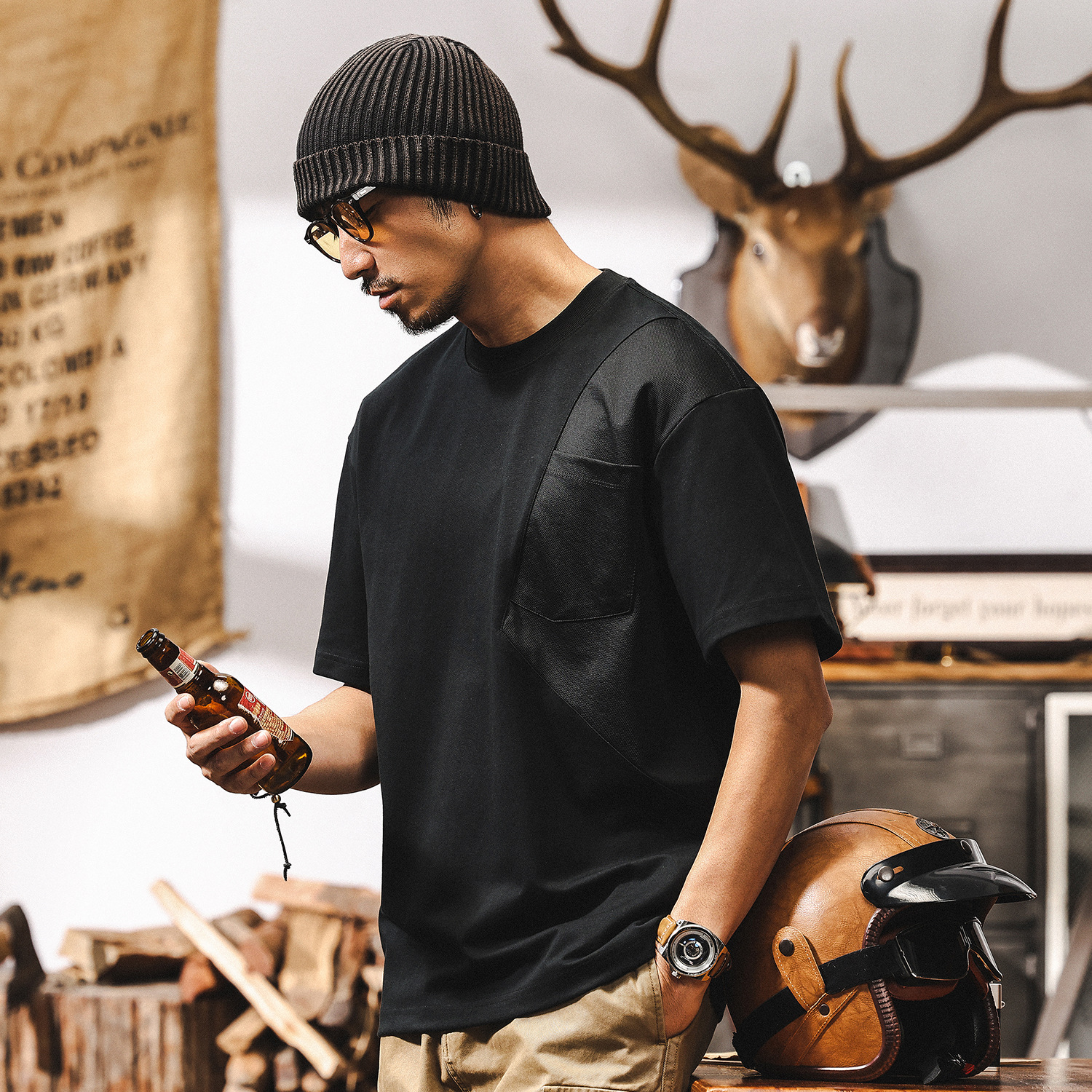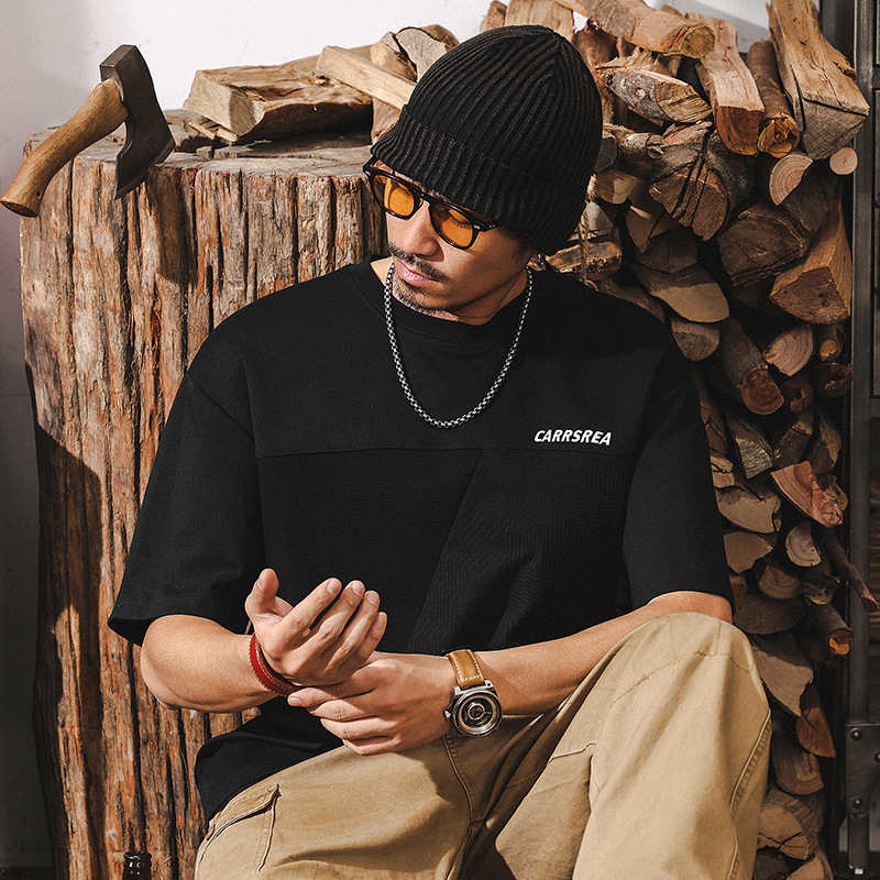 美式涼感科技面料T恤短袖男春季2025新款復古拼接提花休閒上衣男