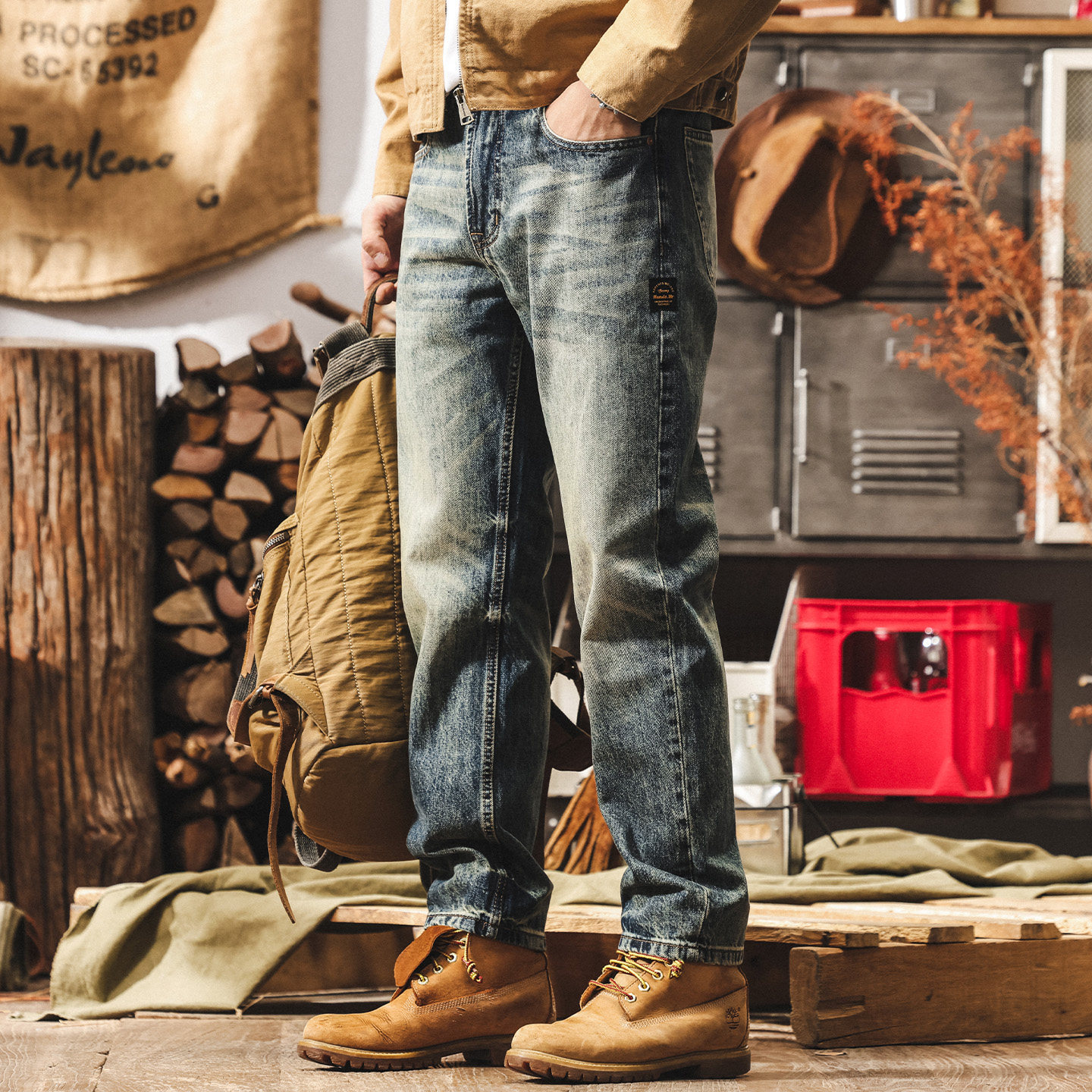美式12.5盎司重磅牛仔褲男寬鬆直筒復古黃泥染水洗秋冬休閒長褲子