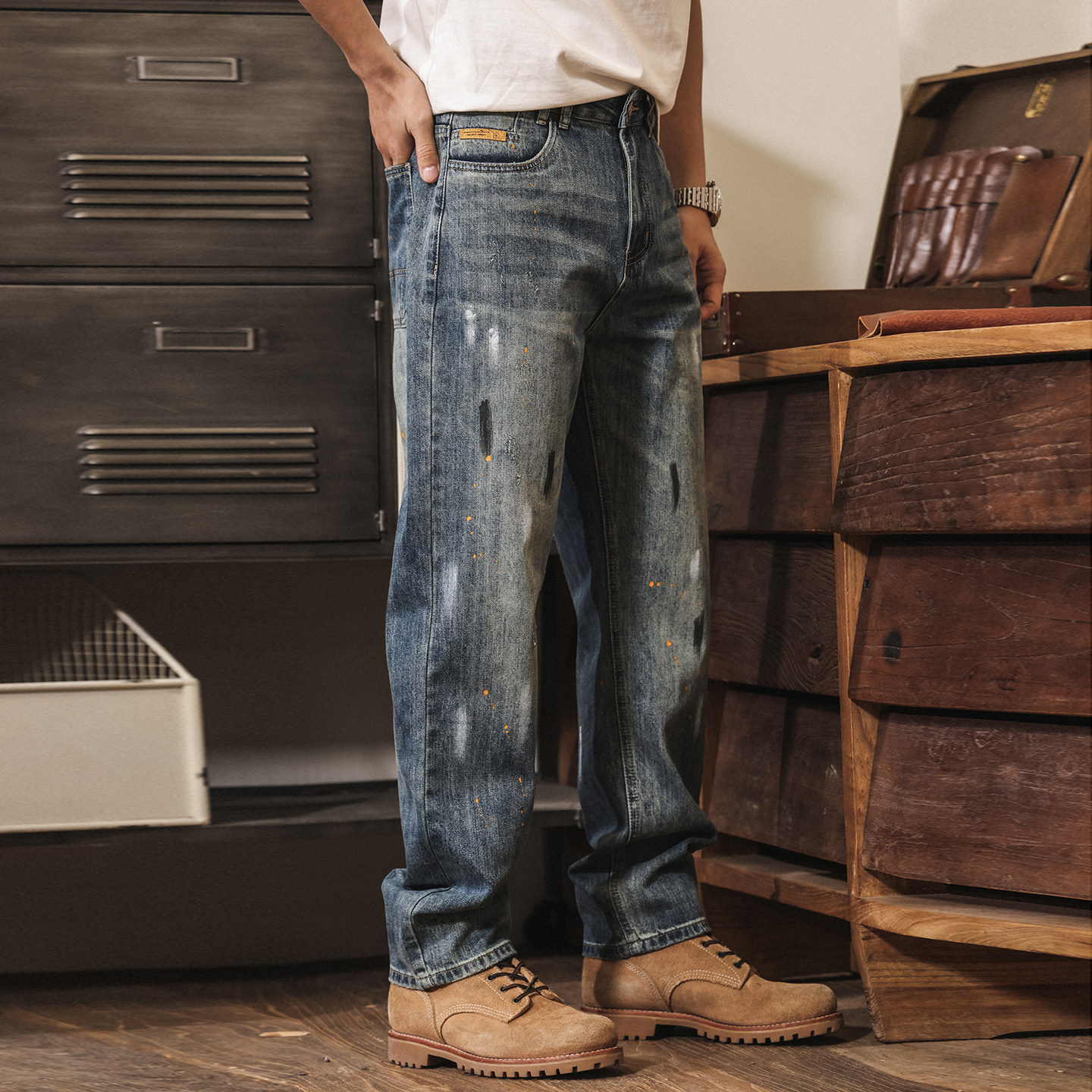 美式復古高街水洗潑墨牛仔褲男士春季潮牌新款寬鬆直筒休閒長褲子