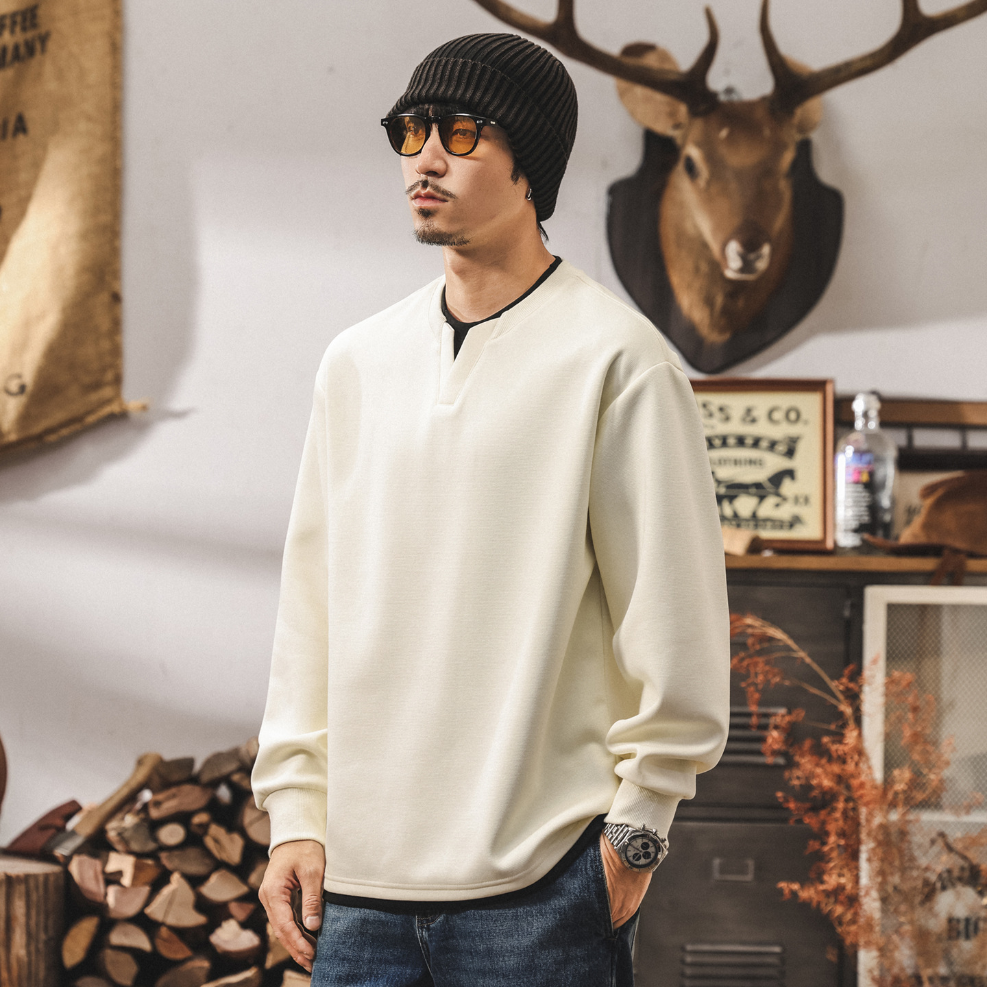 美式復古280g重磅衛衣男春秋2025新款假兩件V領長袖t恤秋季上衣男