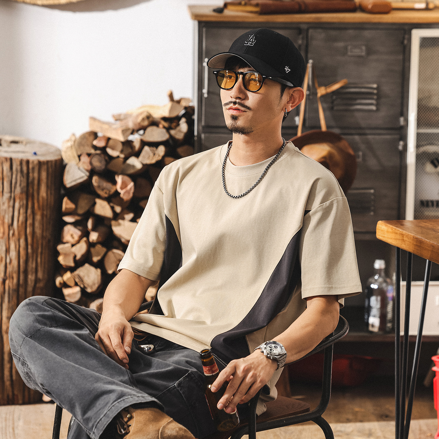 美式潮牌卡其色拼接男士短袖T恤夏季新款2025寬鬆潮牌半袖體恤男