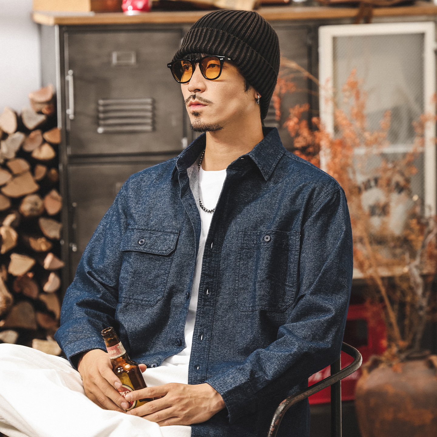 美式復古保色水洗原生靛藍色牛仔襯衫外套男春秋潮牌寬鬆工裝夾克
