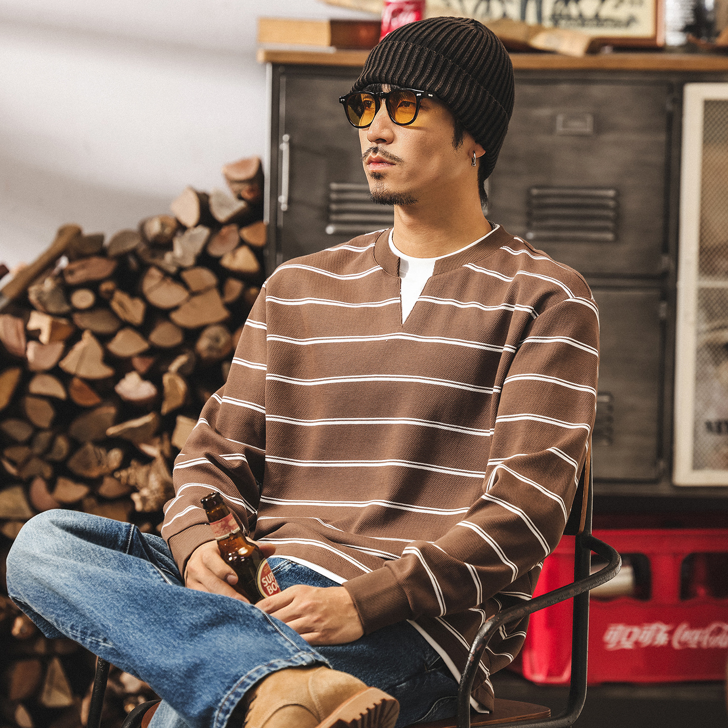 美式復古假兩件衛衣男春秋2025新款重磅條紋V領t恤男長袖寬鬆上衣
