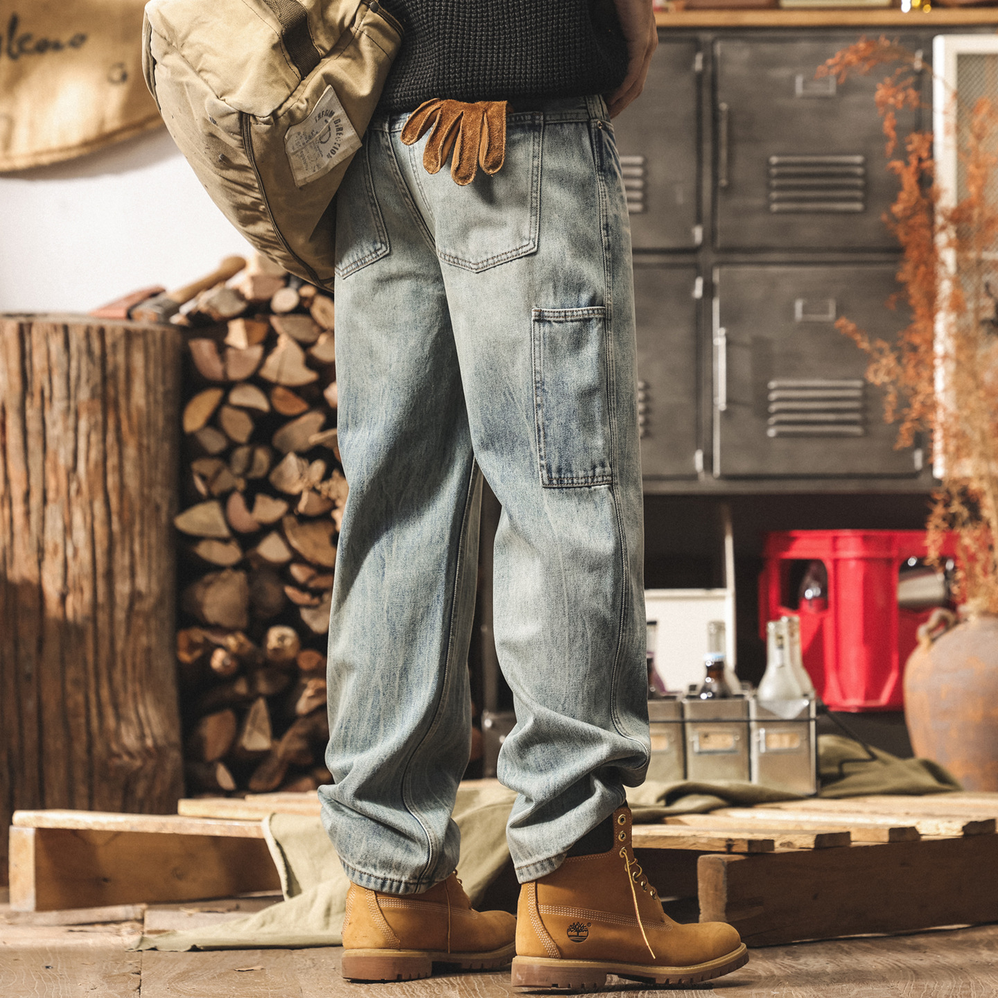 美式重磅復古工裝褲子男潮牌加絨牛仔褲男直筒水洗寬鬆男士休閒褲