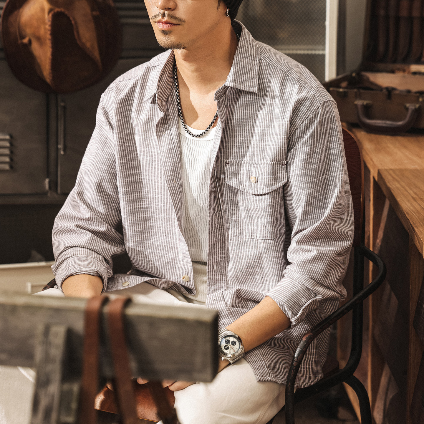 美式復古亞麻條紋長袖襯衫男春季2026新款通勤竹節紋休閒襯衣外套
