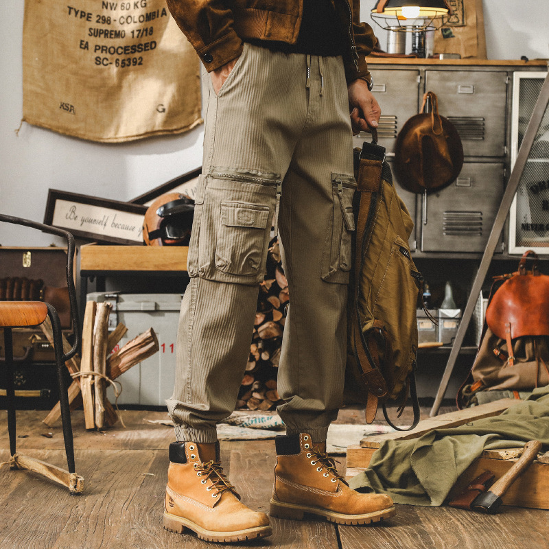 美式複古卡其色工裝褲子男秋季寬松休閑長褲潮牌多口袋男士束腳褲