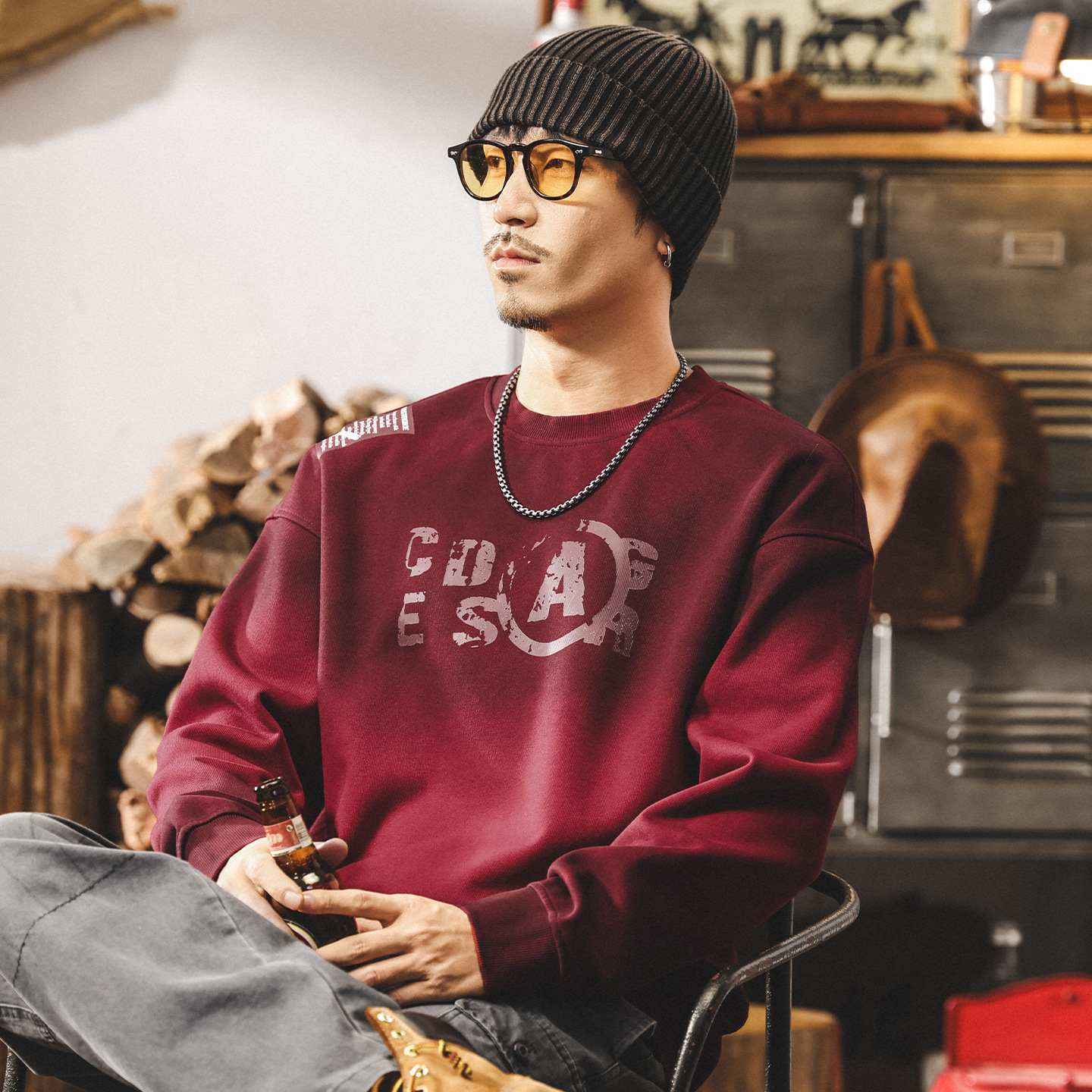 美式復古420g重磅衛衣男春秋新款圓領長袖寬鬆休閒潮流印花上衣男