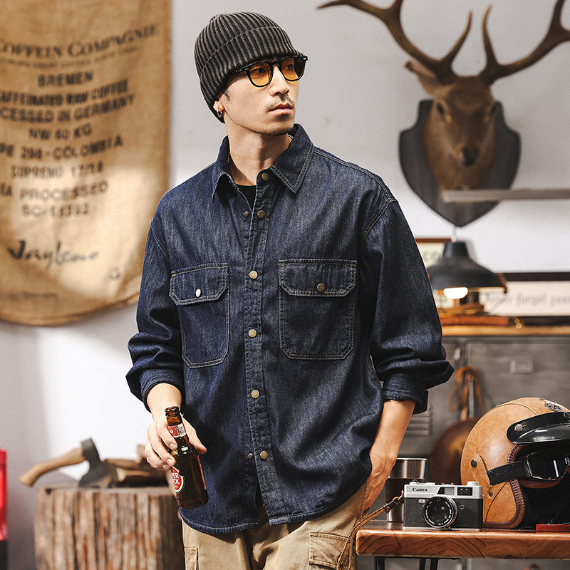 美式復古明線原色牛仔襯衫男春季2025新款工裝長袖襯衣外套男