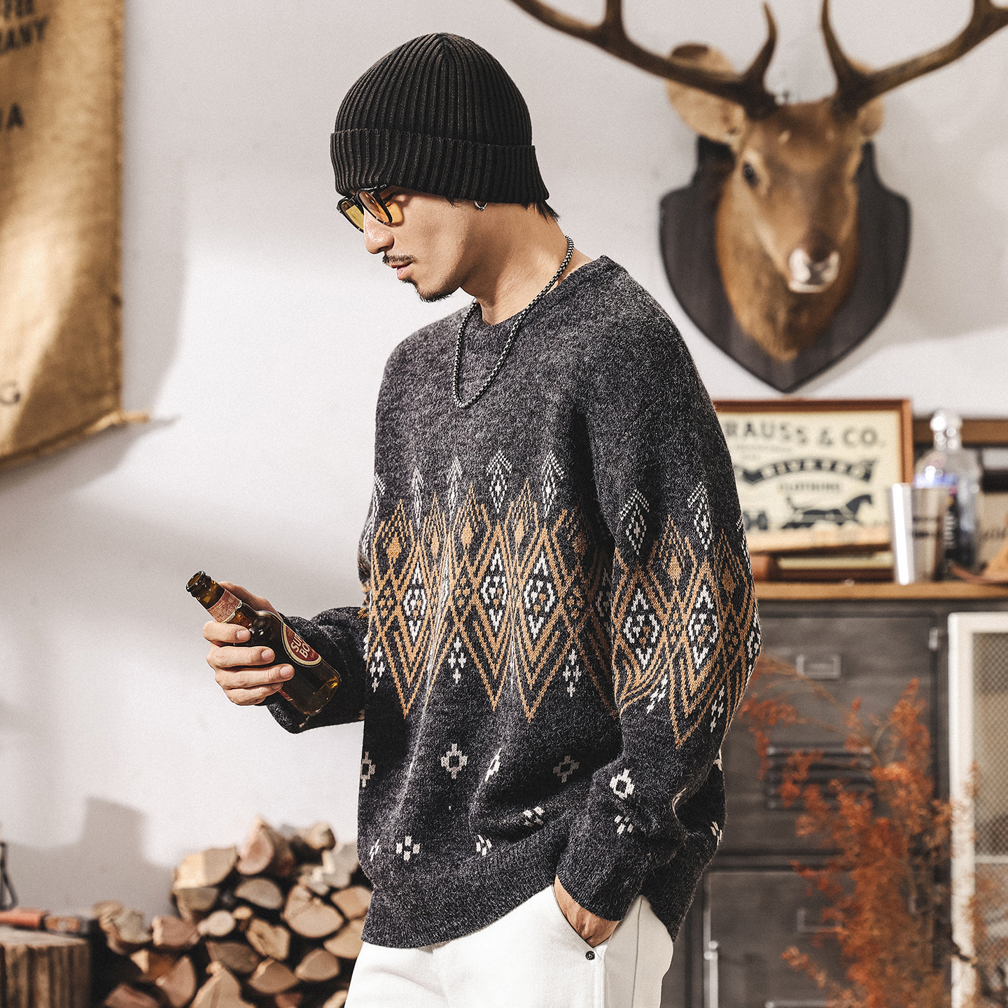 美式復古提花費爾島毛衣男秋冬2025新款潮流民族風寬鬆男士針織衫