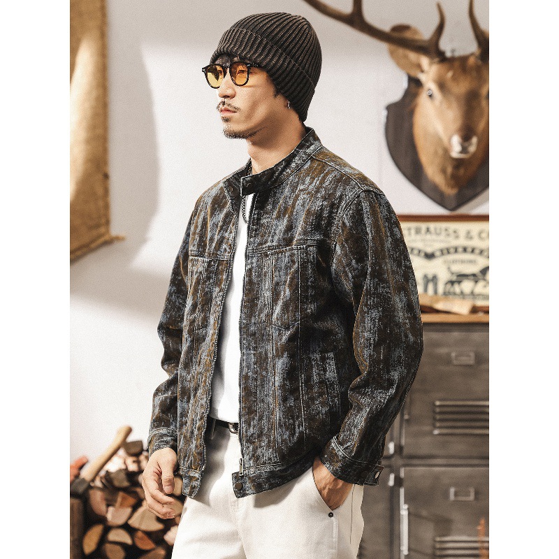 美式復古廢土風植絨斑駁牛仔外套男士秋季新款寬鬆潮流帥氣夾克男
