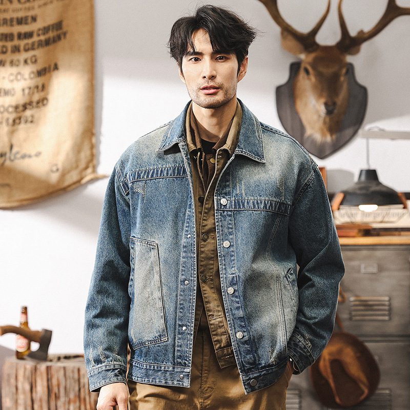 美式復古重磅牛仔外套男秋季2024新款寬鬆潮牌洗褪做舊工裝夾克男
