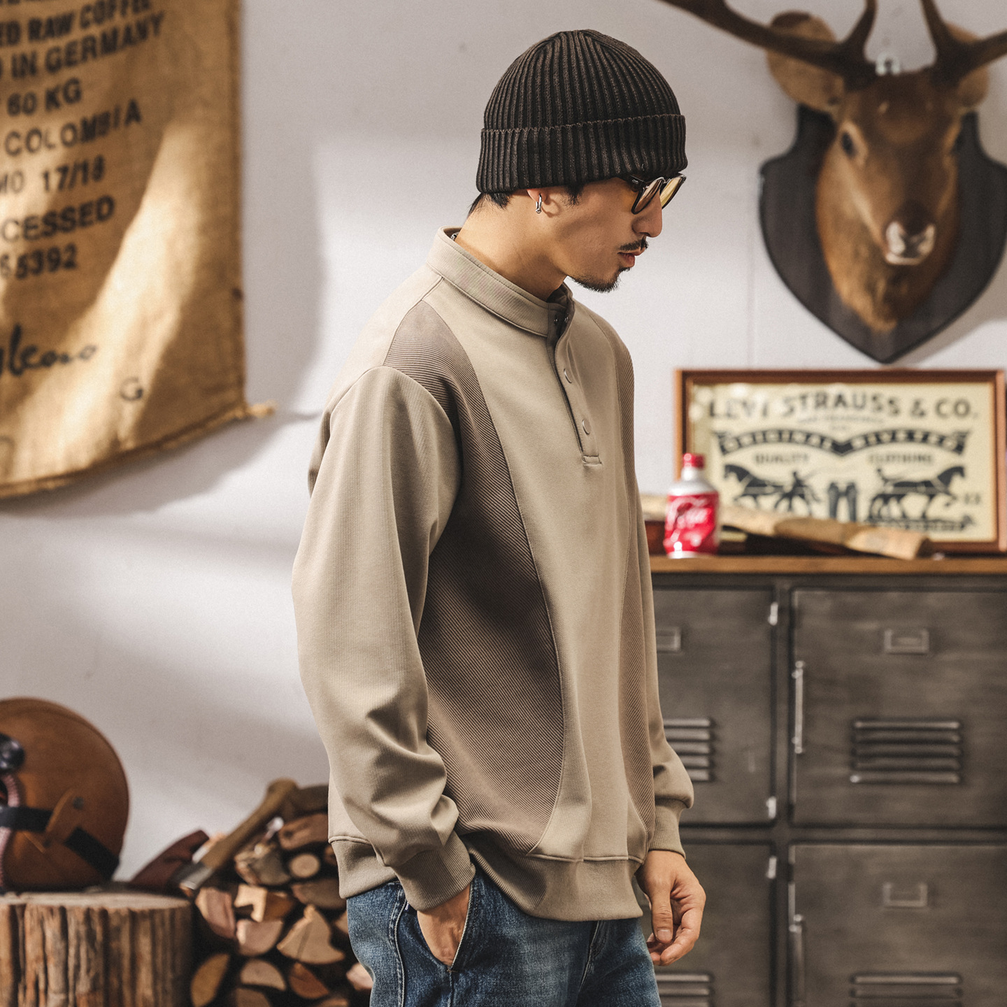 美式復古亨利領重磅衛衣男秋季新款拼接撞色寬鬆大碼休閒立領上衣