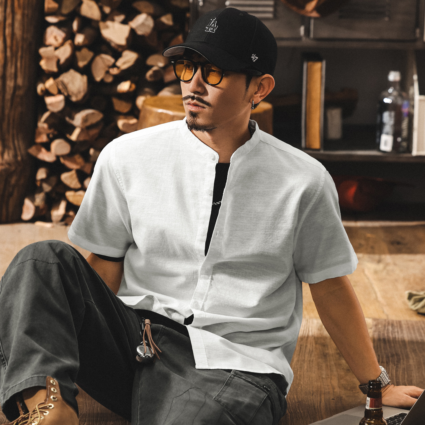中式復古高級感棉麻襯衫男士短袖夏季新款潮牌寬鬆立領國風襯衣男