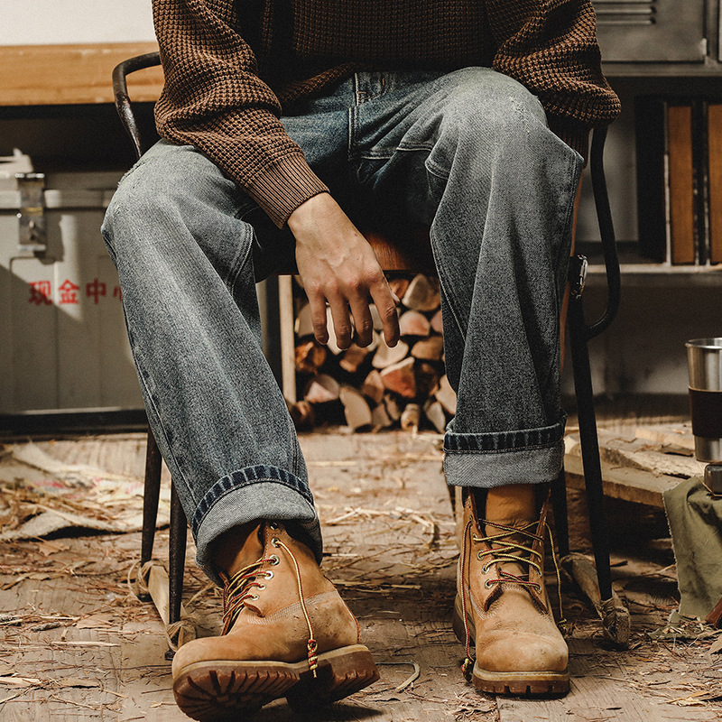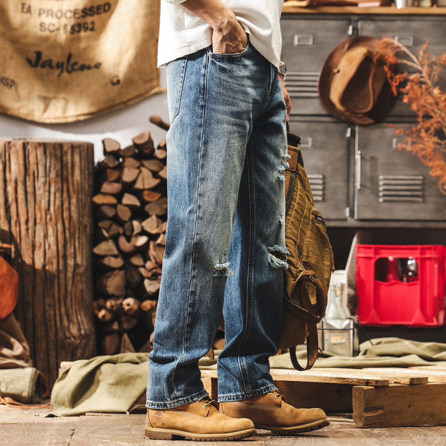 美式經典復古牛仔褲男秋冬款寬鬆直筒大碼潮流重磅石磨水洗闊腿褲