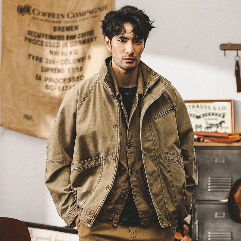 美式重磅復古麂皮絨外套男春秋美拉德古着寬鬆機車立領工裝夾克男