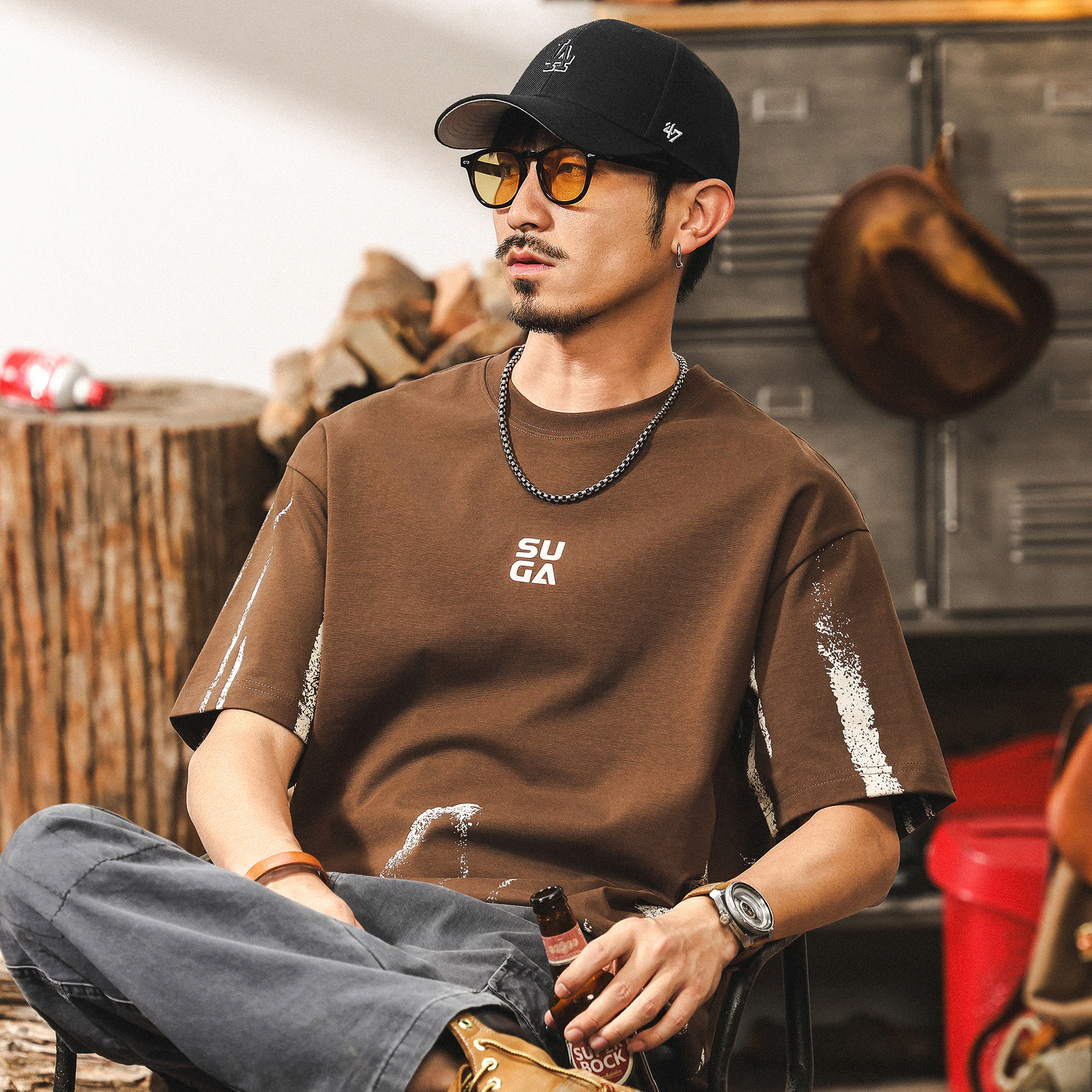 235g重磅發泡印花T恤男夏季短袖2024新款美式復古潮牌寬鬆上衣男