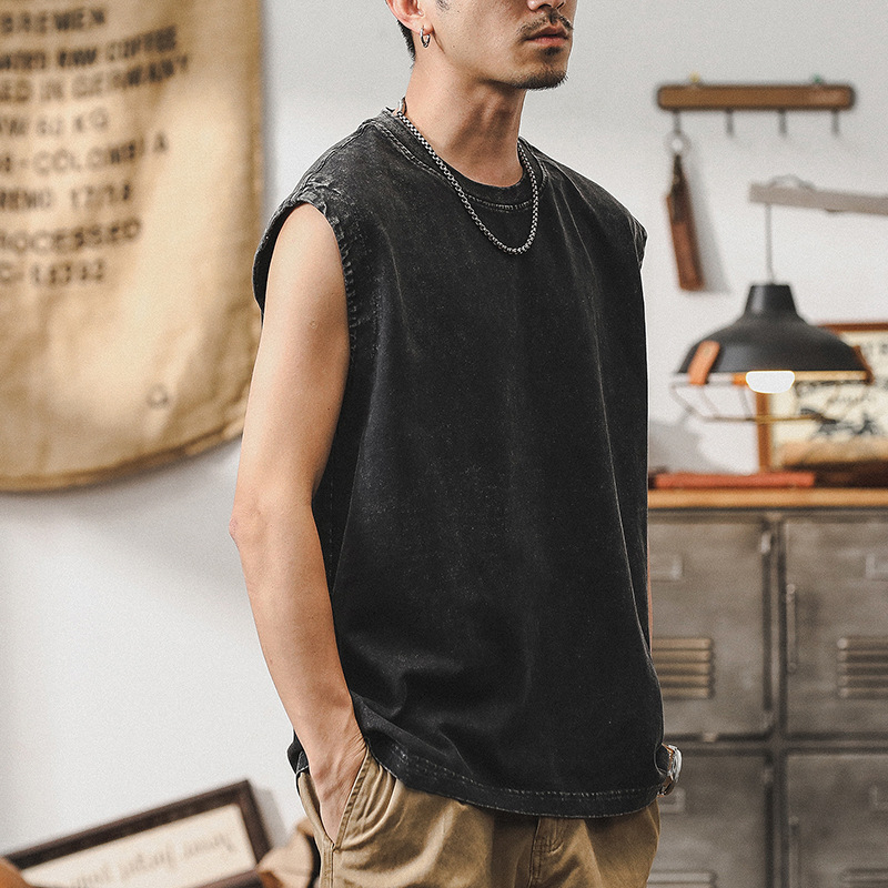 美式復古男士背心夏季寬鬆炒雪花水洗重磅T恤坎肩運動無袖上衣男T
