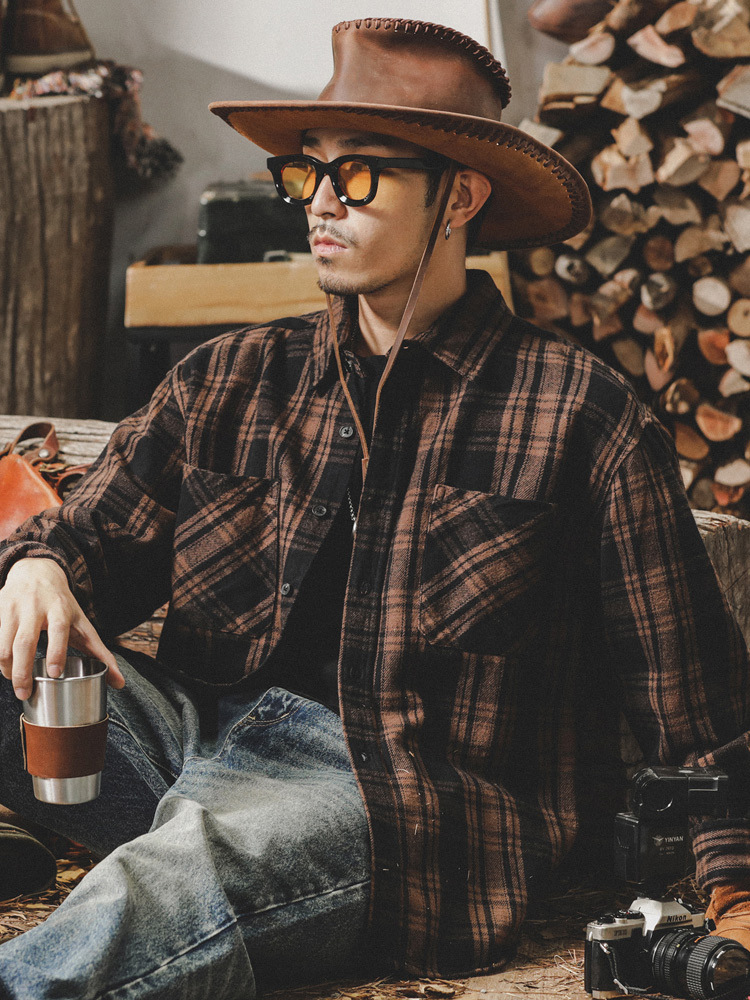美式復古重磅純棉長袖格子襯衫男加厚寬鬆休閒襯衣潮牌外套秋冬款