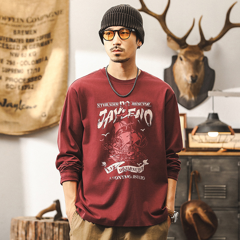 美式復古260g重磅長袖T恤男秋季潮流印花體恤男士酒紅色上衣