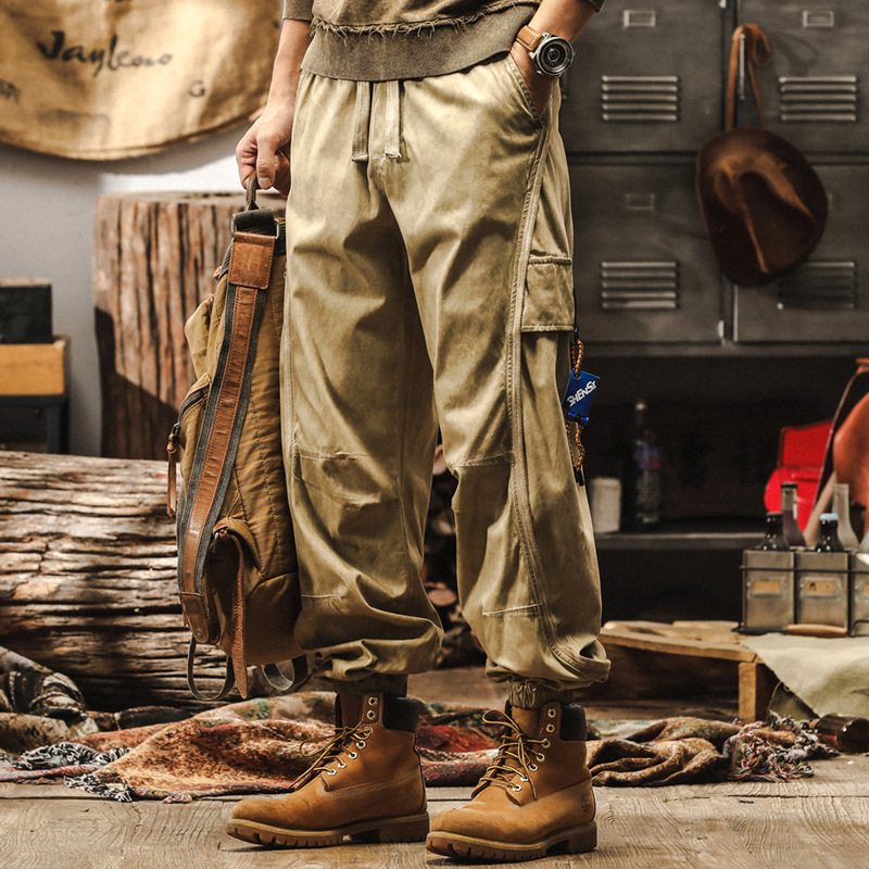 美式復古簡約百搭工裝休閒褲男秋季寬鬆潮牌2024新款卡其色褲子男