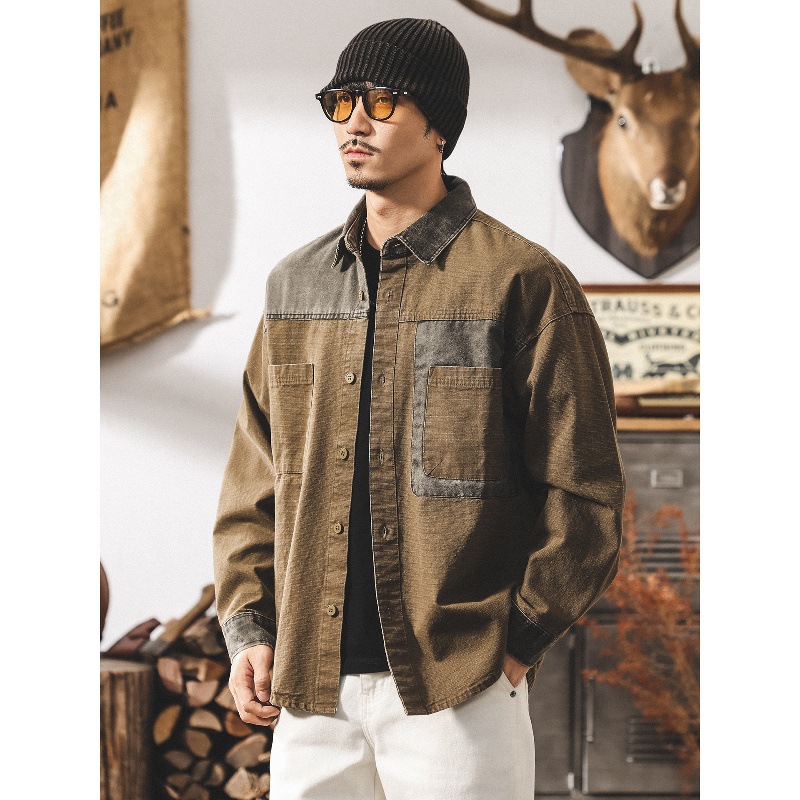 美式復古做舊工裝襯衫外套男春秋2025新款潮牌拼接寬鬆長袖襯衣男