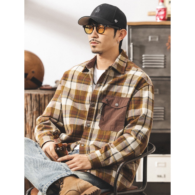 美式復古色織格子襯衫男長袖秋季寬鬆2024新款日系潮牌工裝外套男