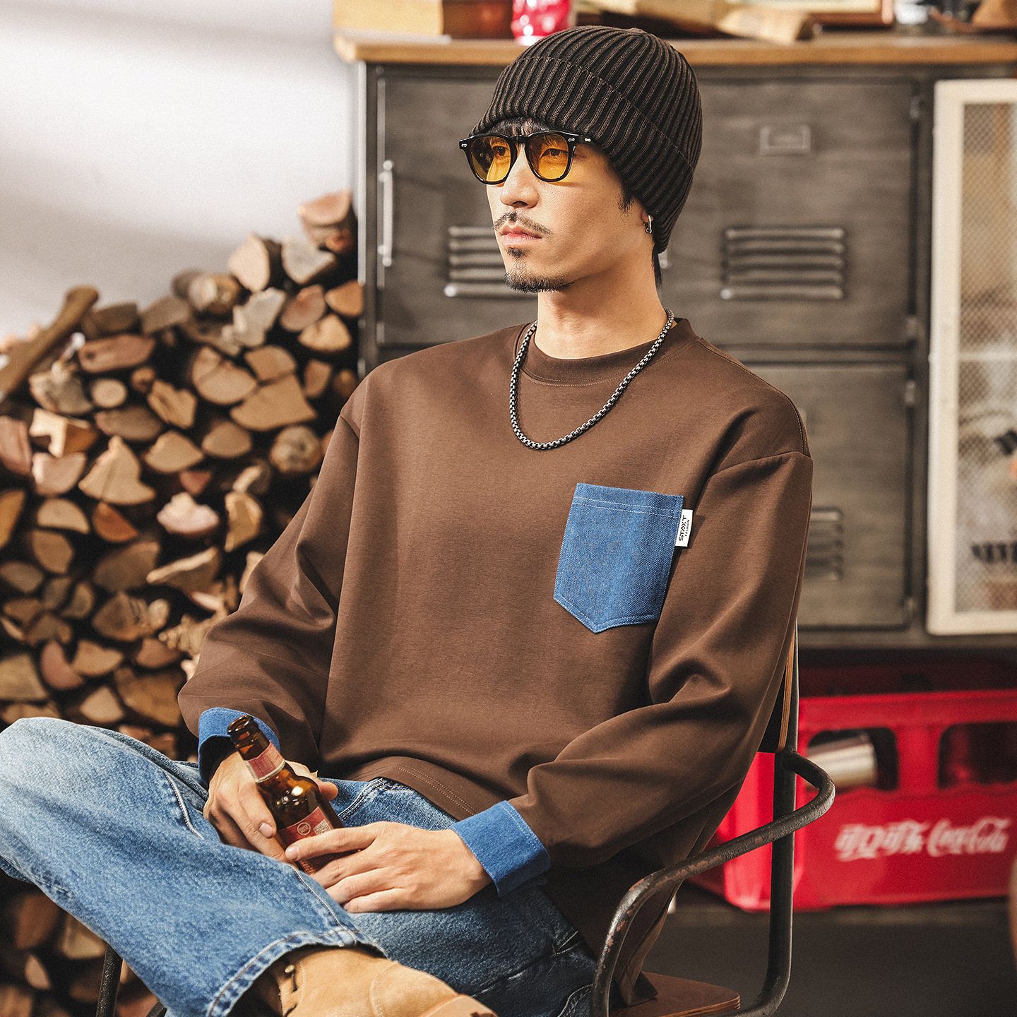 美式復古萊賽爾空氣層衛衣男春秋潮牌300g重磅寬鬆牛仔撞色上衣男