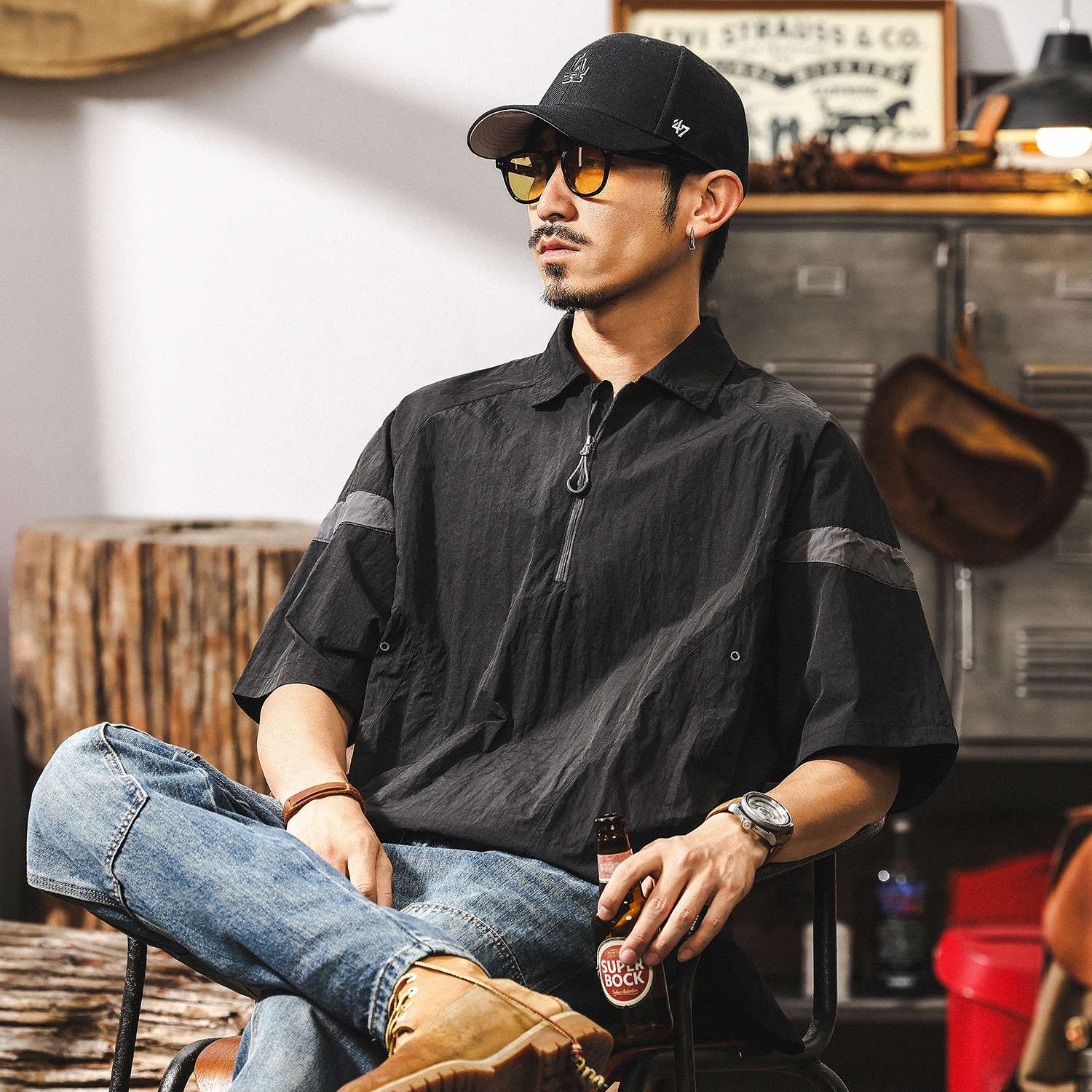 美式復古半拉鍊男士polo衫短袖男夏季薄款彈力戶外機能速乾T恤男