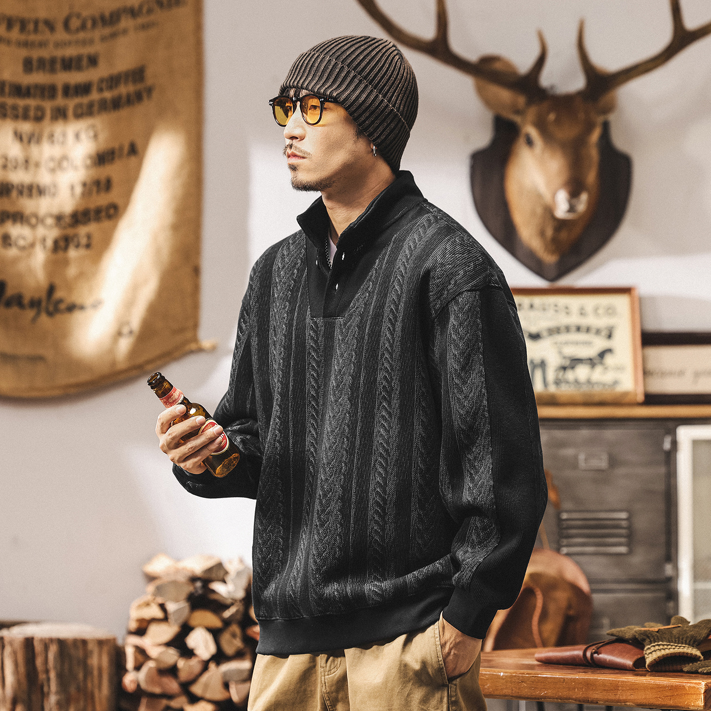 美式復古磨毛條紋針織重磅衛衣男秋季新款潮牌寬鬆肌理感休閒上衣